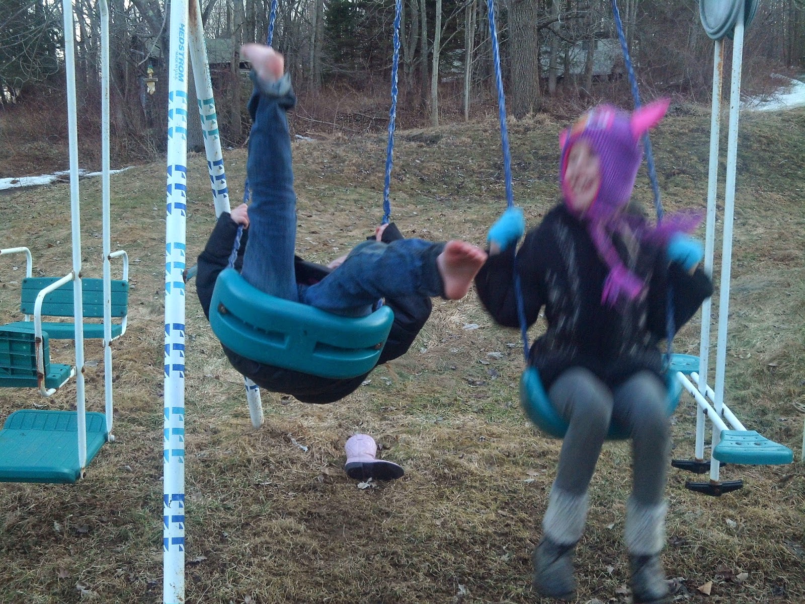 while we waited for daddy to return the girls played on the swings it was fun lily was swinging and as I was taking the picture her boots flew right off the one almost hit me